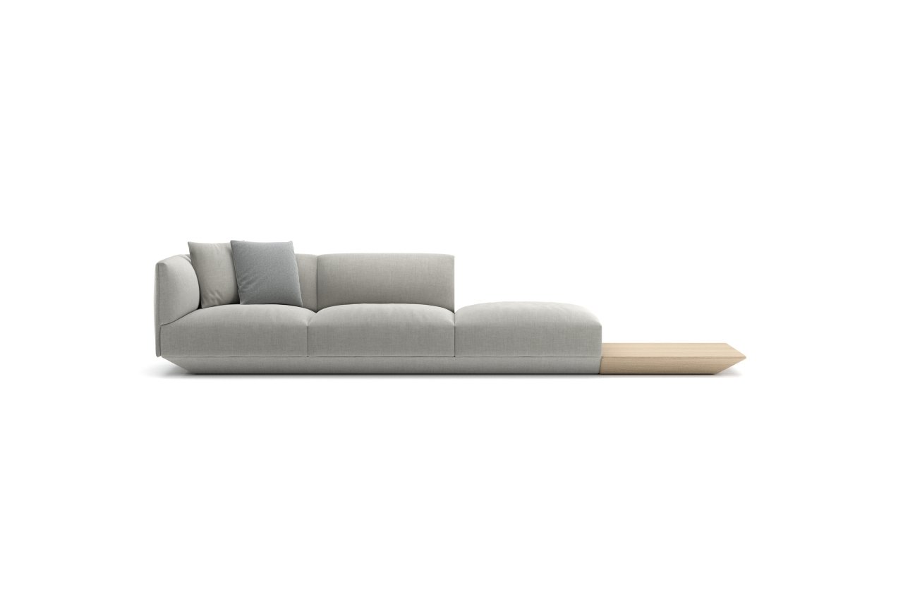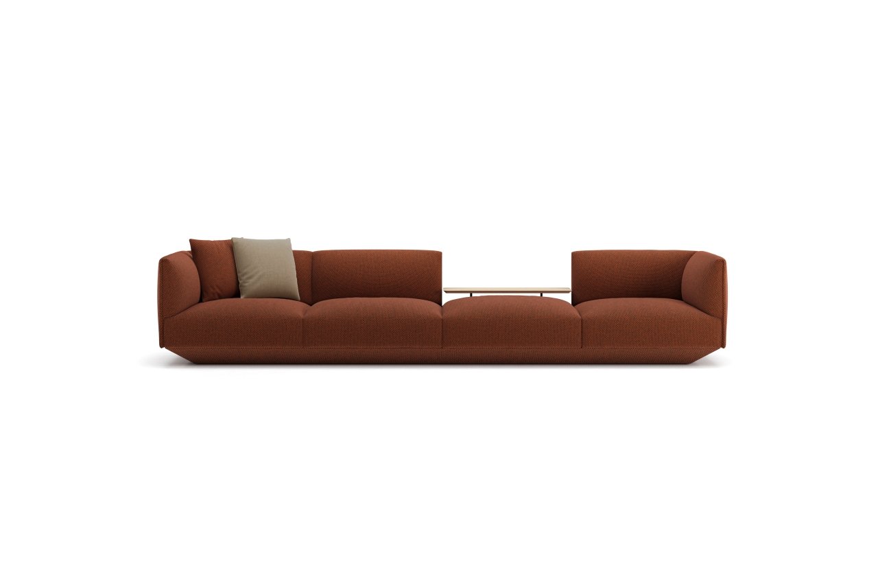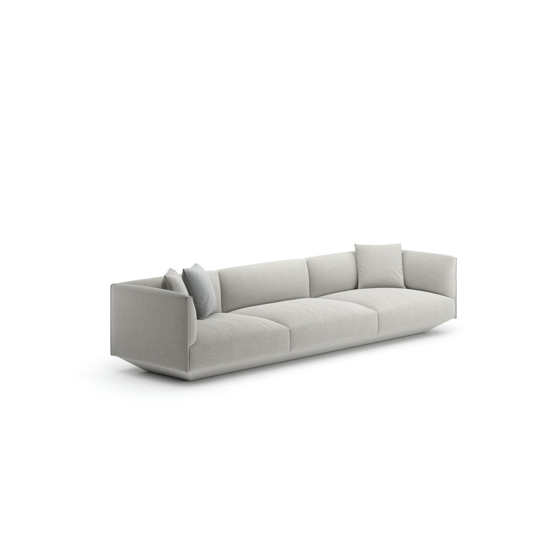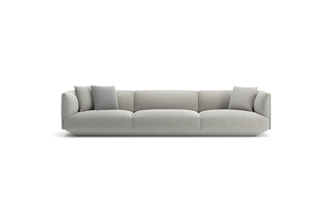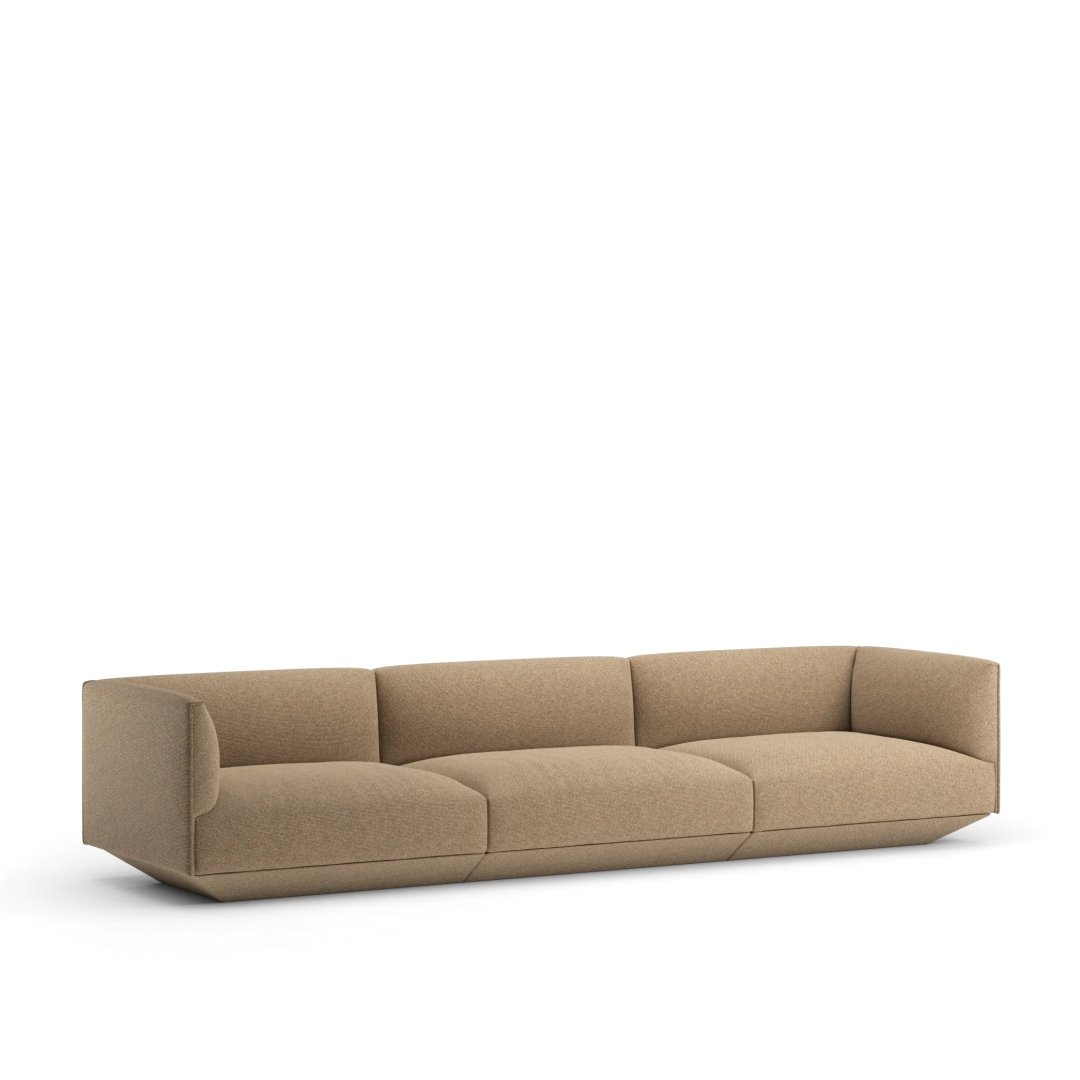 Spacious comfort with a weightless look. Sculpted volumes and a tapered, “levitating” base give it a quiet architectural presence, while deep seats, low arms, and modular side tables let you build the layout you want.