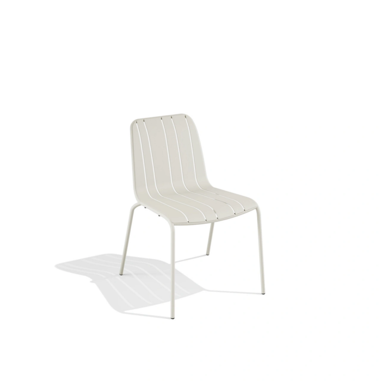 The steel stackable chair has an irregular slatted seat that offers a dynamic image.
