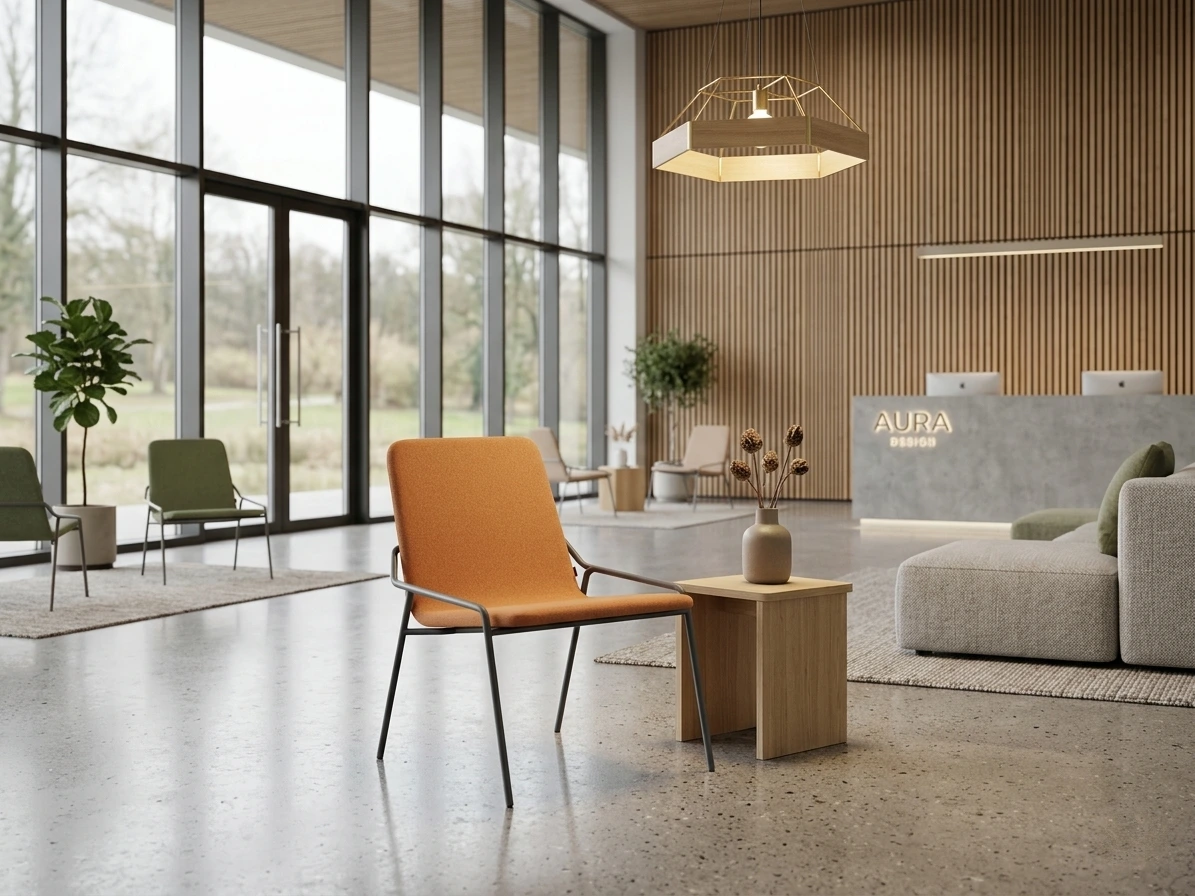The Dupont Lounge Upholstered combines soft comfort with clean, refined lines, offering a relaxed and supportive seating experience through its gently reclined form. Its upholstered shell and slim metal base create a warm, versatile lounge chair suited to contemporary commercial and residential interiors.