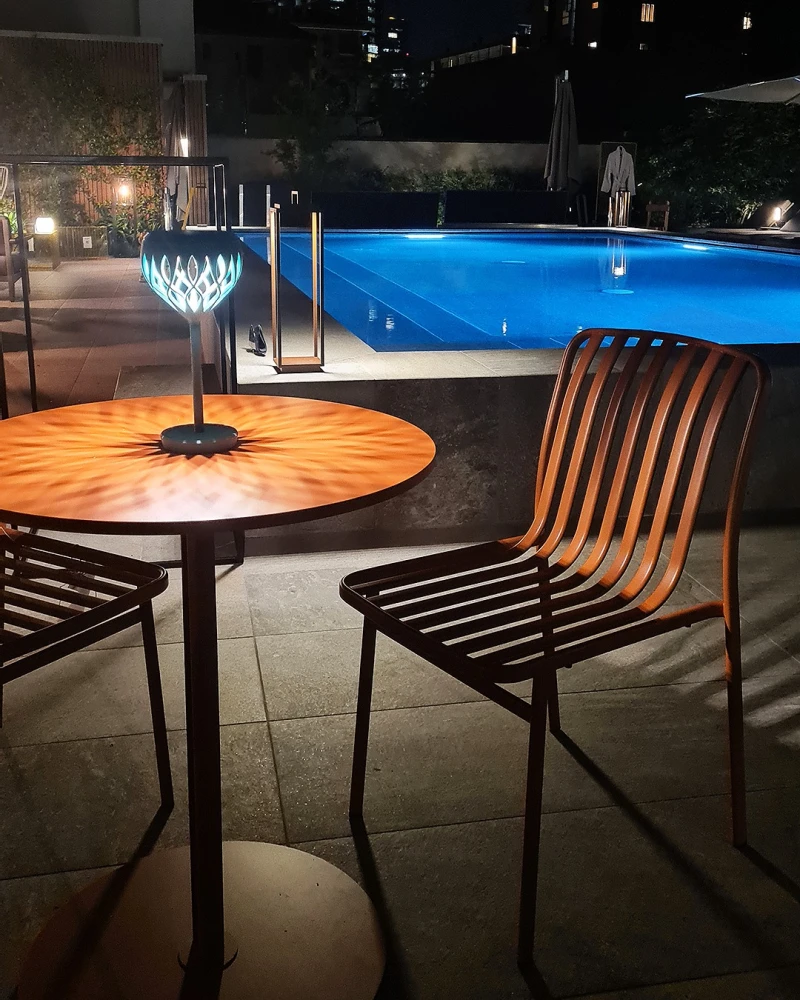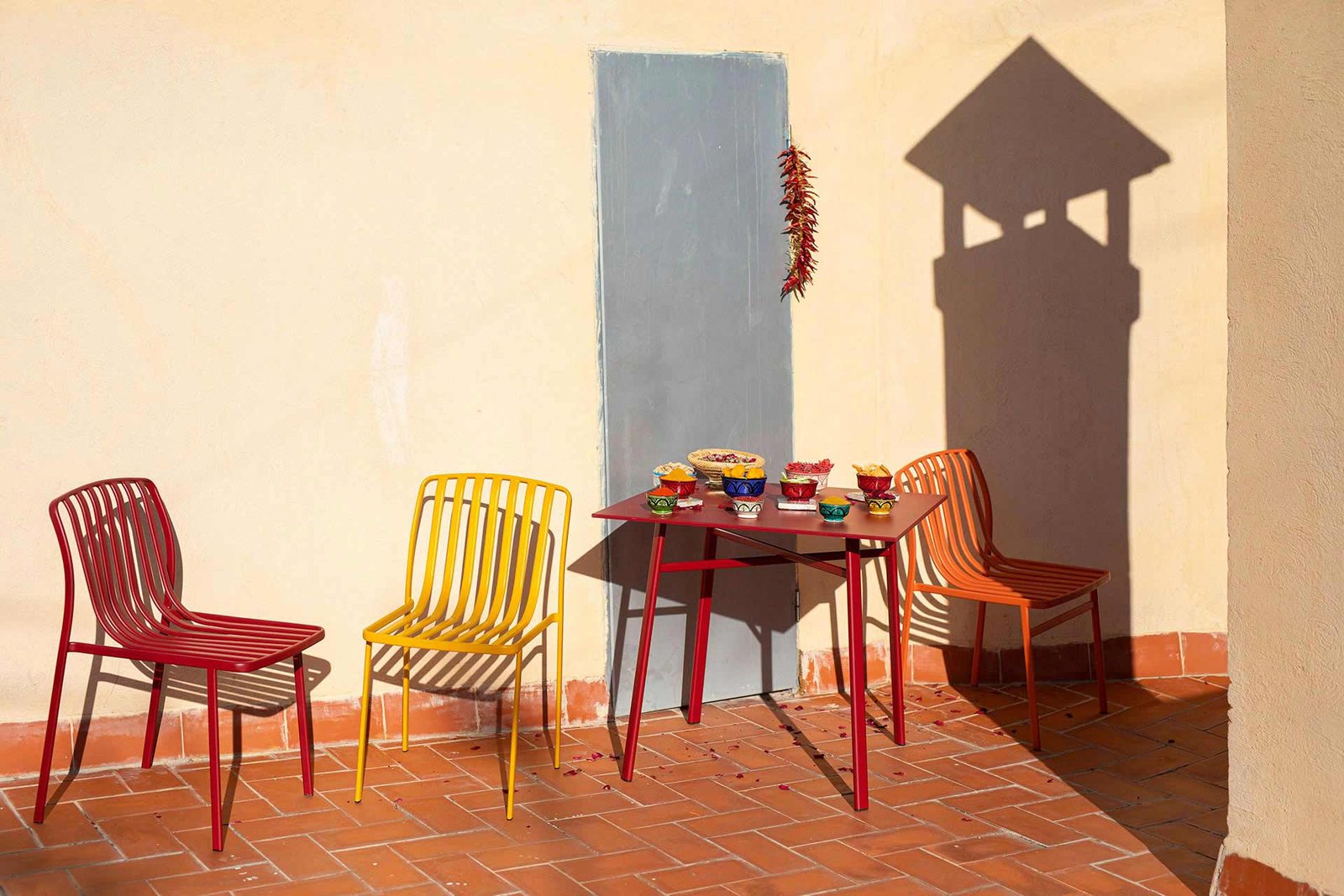 Industrial production and craftsmanship are combined in Denis Barbiero’s Kano collection. The chairs and small armchairs are stackable, the sofas and dormeuse are made of tubular steel, creating a beautiful alternation of full and empty spaces, strength and lightness. The tables have different tops, including an elegant Iroko version. The collection colours can be mixed to create customised compositions using the cushions and mats chromatic effects.