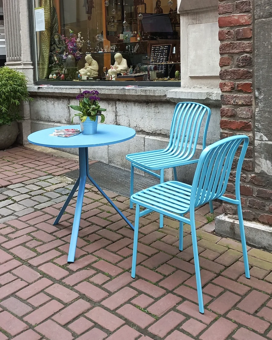 The chairs and small armchairs are stackable, the sofas and dormeuse are made of tubular steel