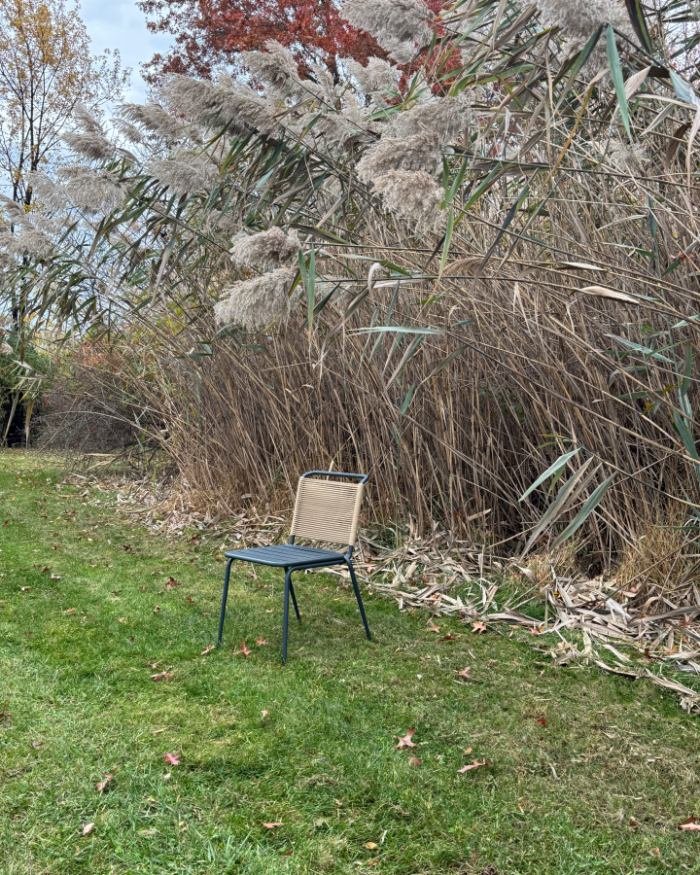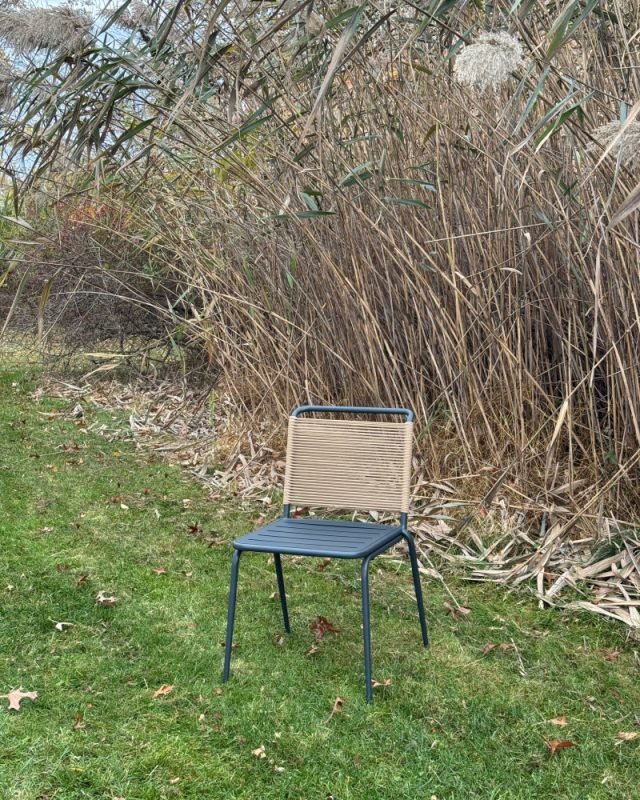 Galvanized steel stackable chair with rope backrest, incredibly comfortable.