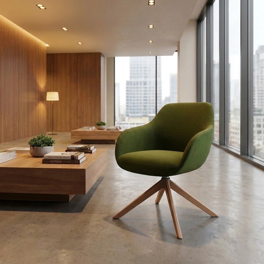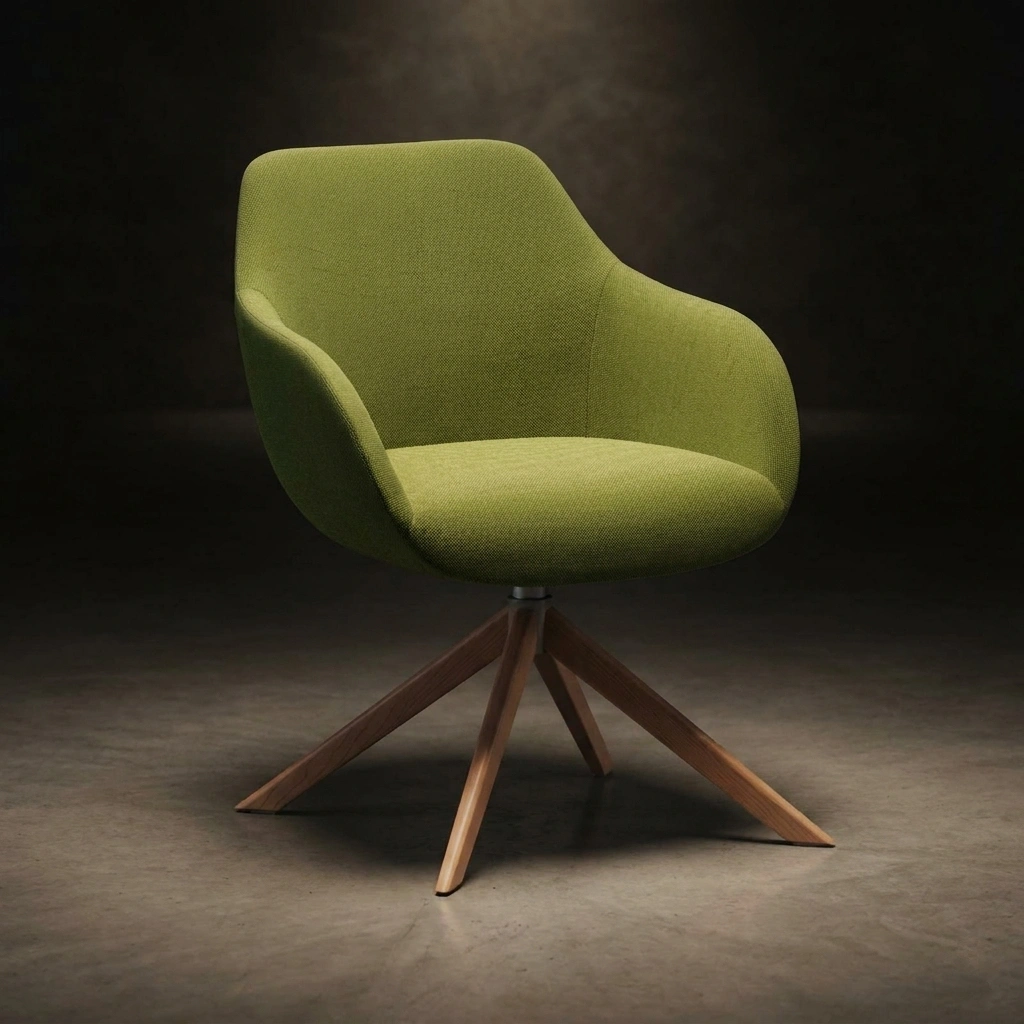 The Lamy Wood Swivel Chair brings together compact proportions, fluid lines, and a warm wood base to create a refined seating solution with both comfort and clarity. Its tailored silhouette and sculpted upholstered shell make it a versatile choice for workspaces, meeting rooms, and hospitality interiors.