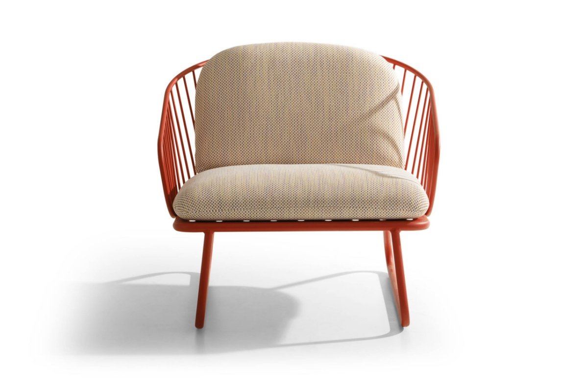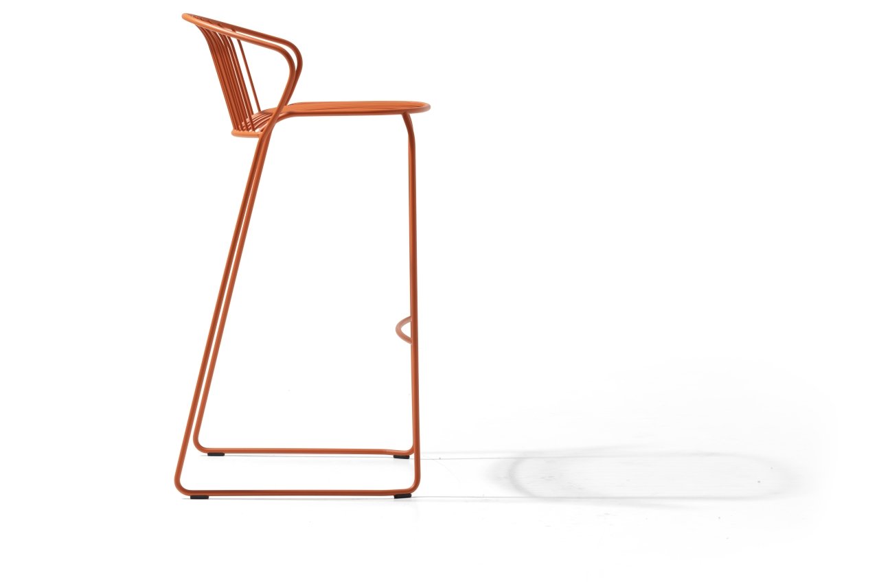 Metal rod frame in two different sections, epoxy powder coated with galvanic treatment for outdoor use. Black polypropylene feet. Available also with seat pad option.