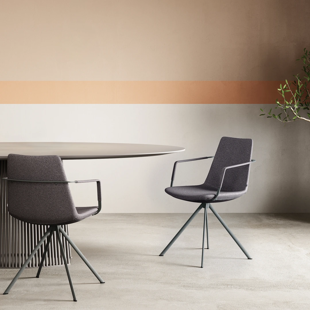 The Pera Ellipse Chair with Arms pairs a sculpted scoop-shaped seat and integrated armrests with a clean elliptical base, bringing added comfort to its refined modern silhouette. Built with injection-molded polyurethane foam over a steel frame and available in a wide range of fabric or leather upholstery.
