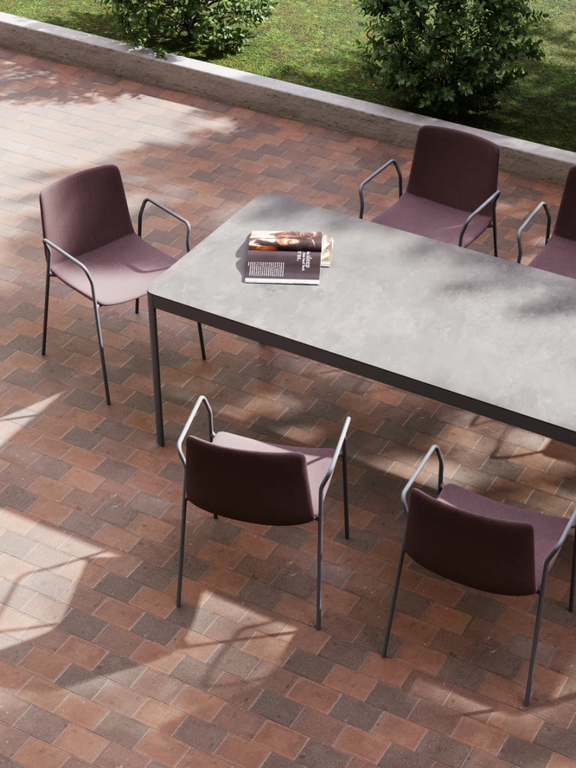 Designed for convenience, the Rest chair can be easily packed due to its light and compact design. Its polypropylene envelope and stainless steel legs, available in three versions – with an upholstered seat or completely upholstered – ensure enduring use. The wire-legged and armed model, attachable as needed, provides a practical gathering solution and the ease of floor cleanup. Offering customization with its armless model, two-leg alternatives, and upholstered back and seat options suitable for outdoor conditions, Rest caters to specific needs and styles.