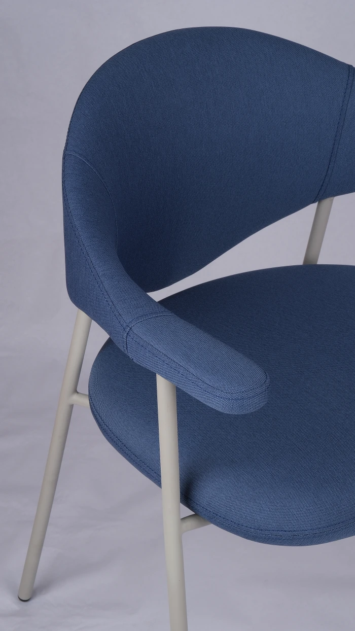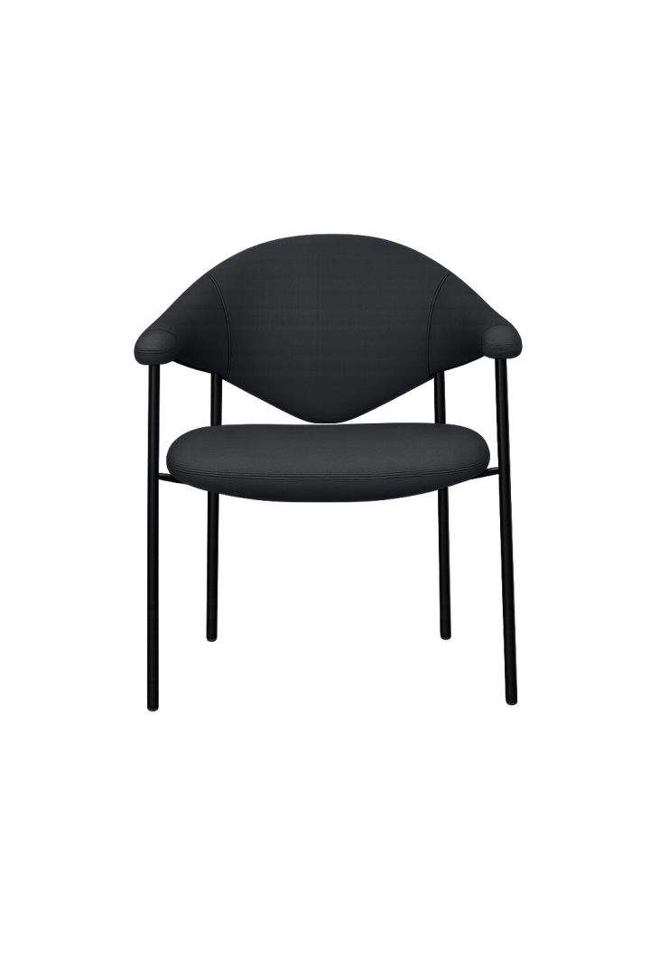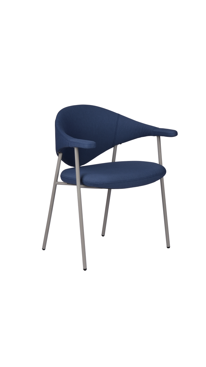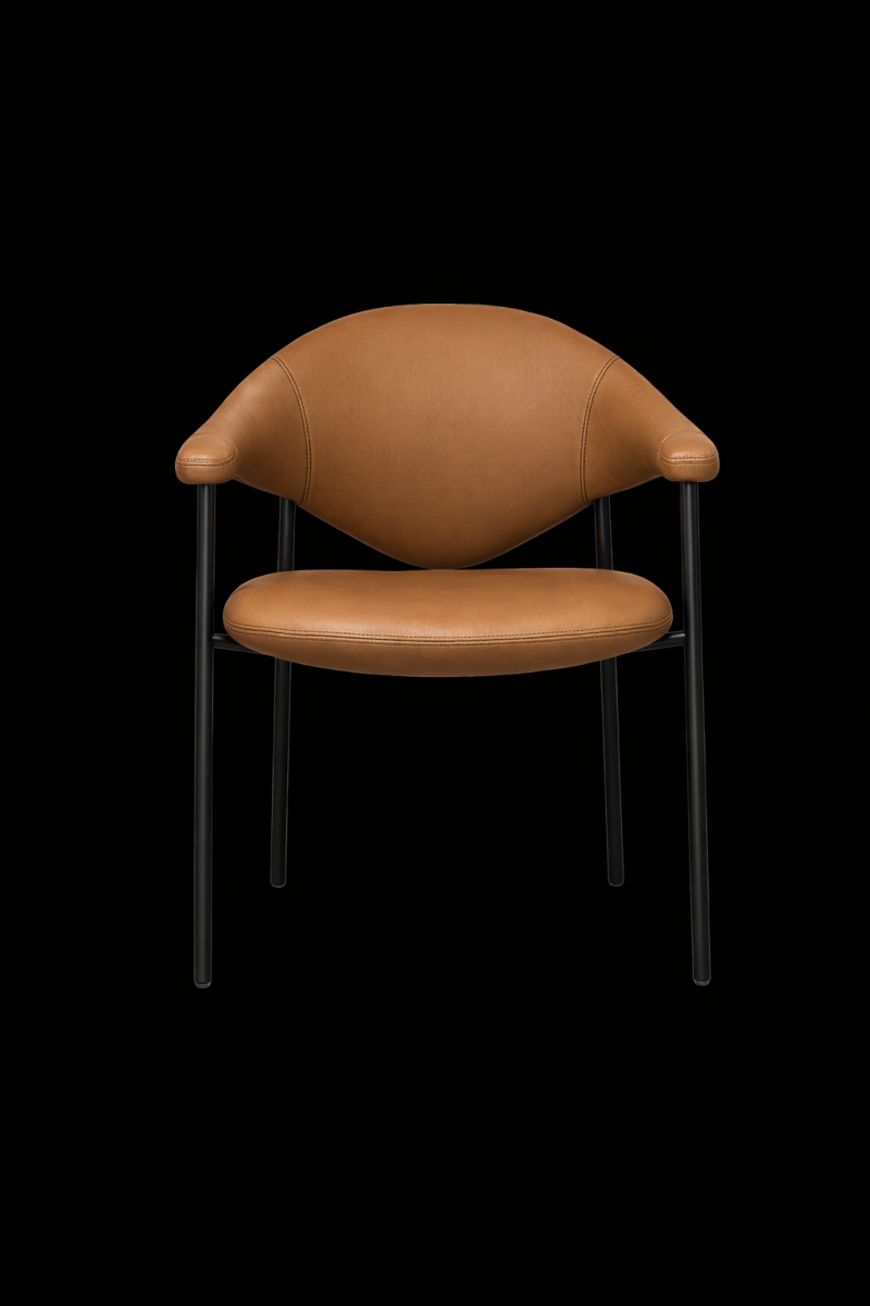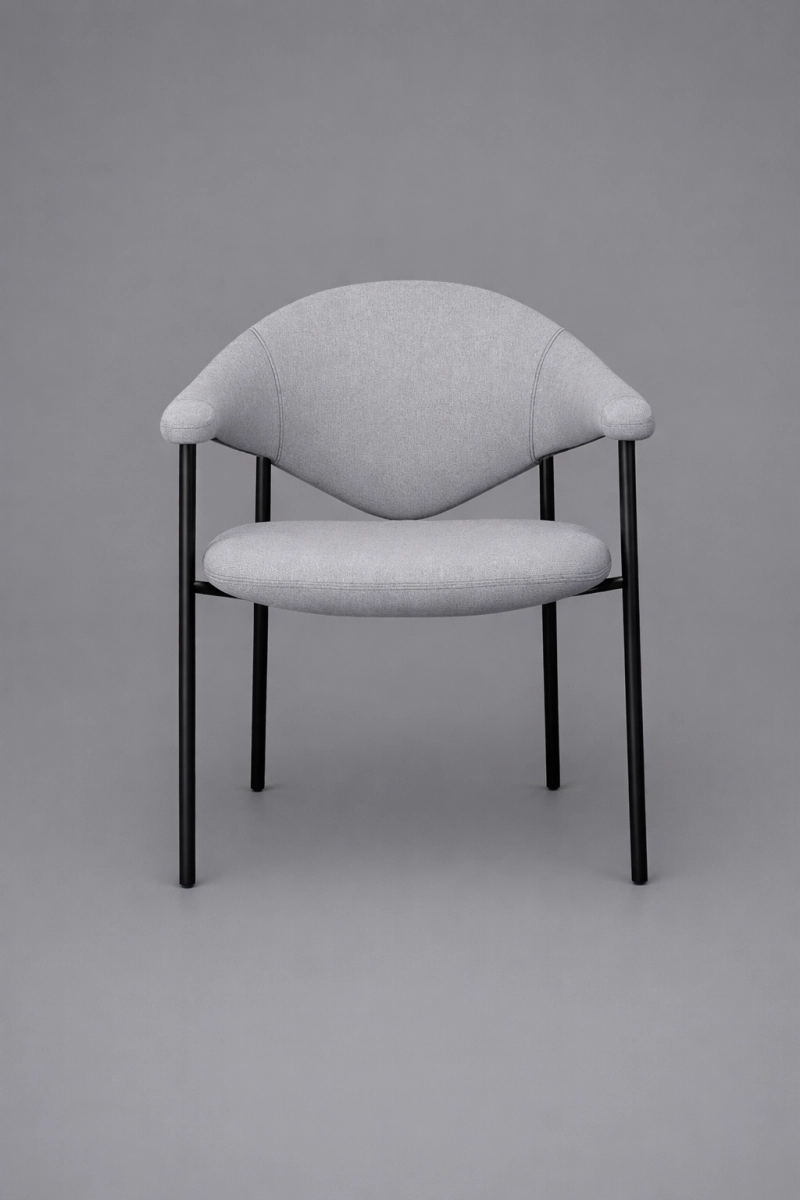 Its sculptural silhouette pairs a softly curved back with integrated armrests for supportive, all-day comfort, while slim Ø19 mm powder-coated metal tube legs keep the look light and modern. Offered in fabric, faux leather, or genuine leather to suit a wide range of interiors.