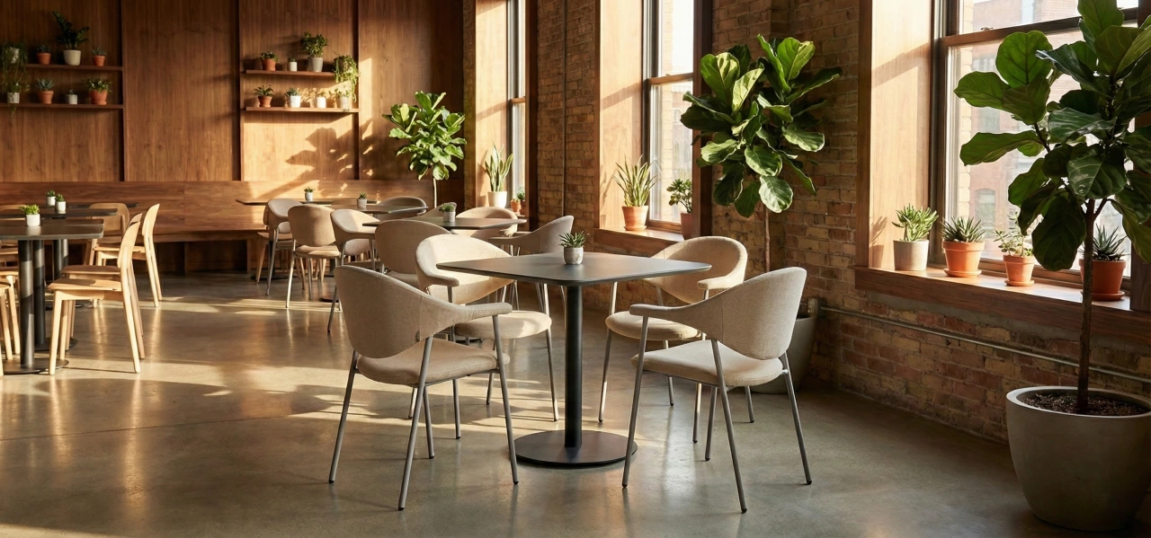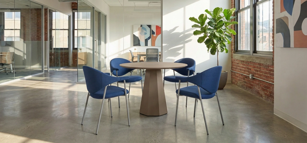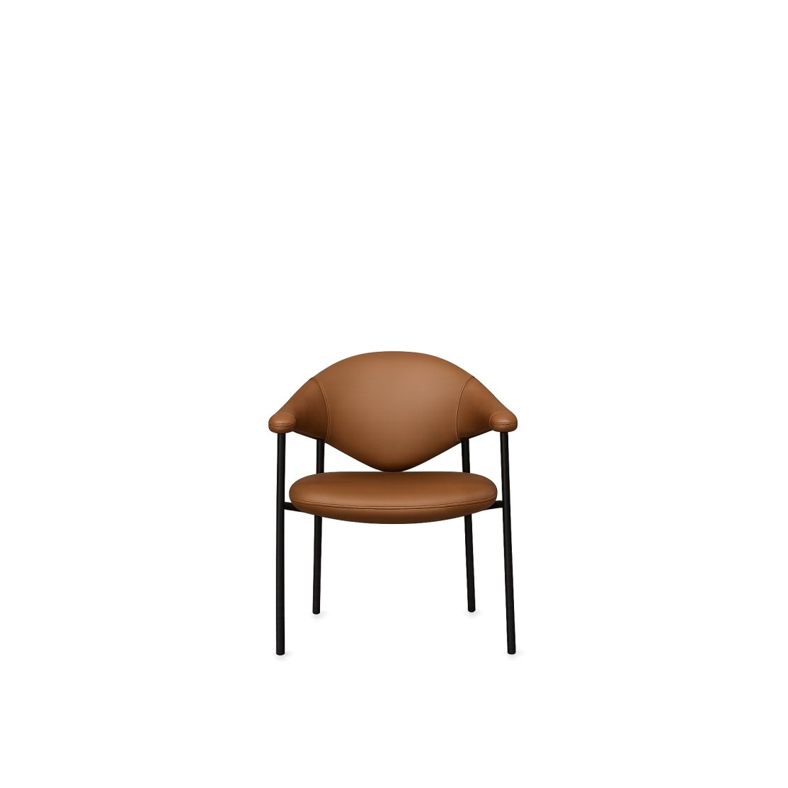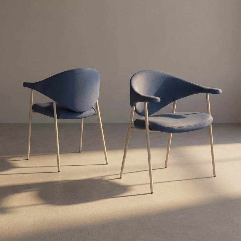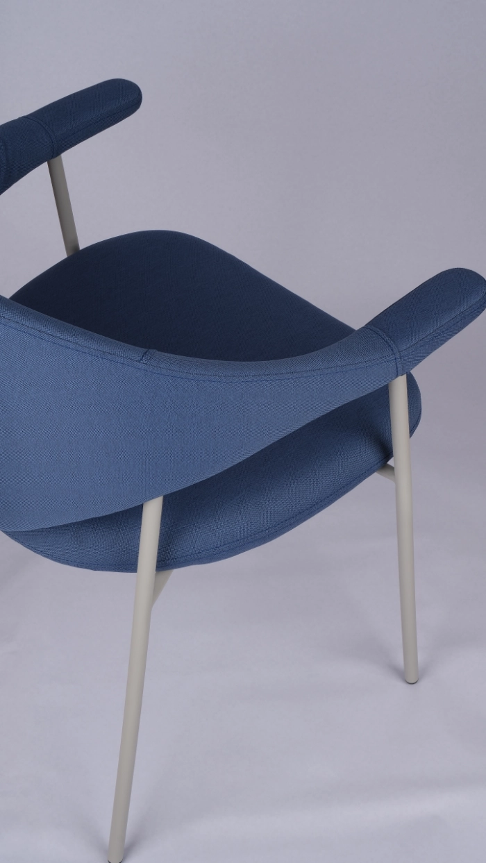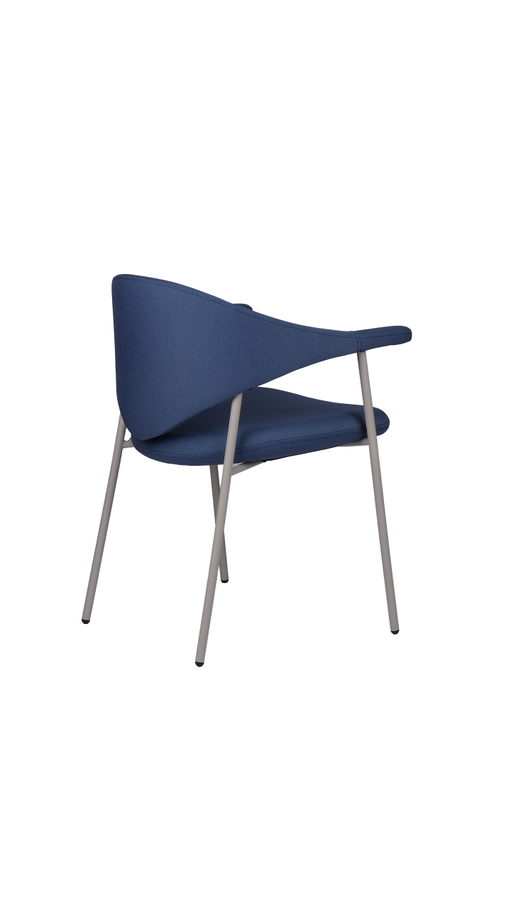 Its sculptural silhouette pairs a softly curved back with integrated armrests for supportive, all-day comfort, while slim Ø19 mm powder-coated metal tube legs keep the look light and modern. Offered in fabric, faux leather, or genuine leather to suit a wide range of interiors.