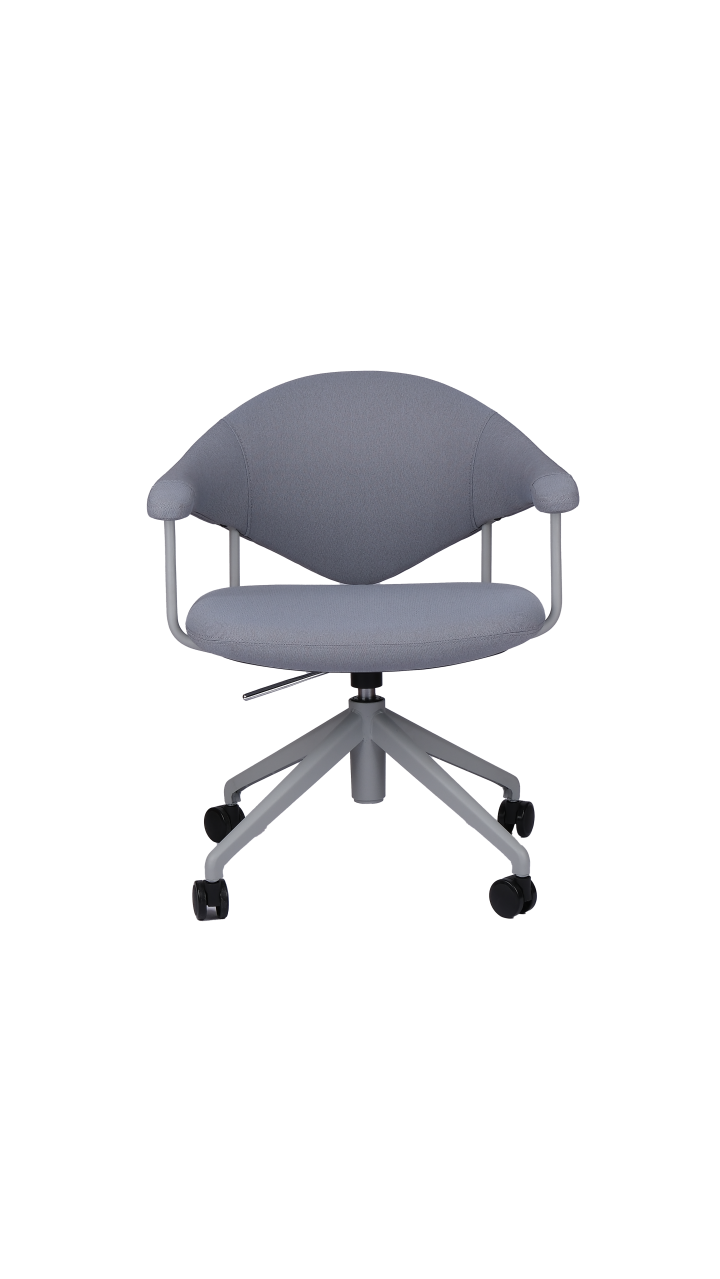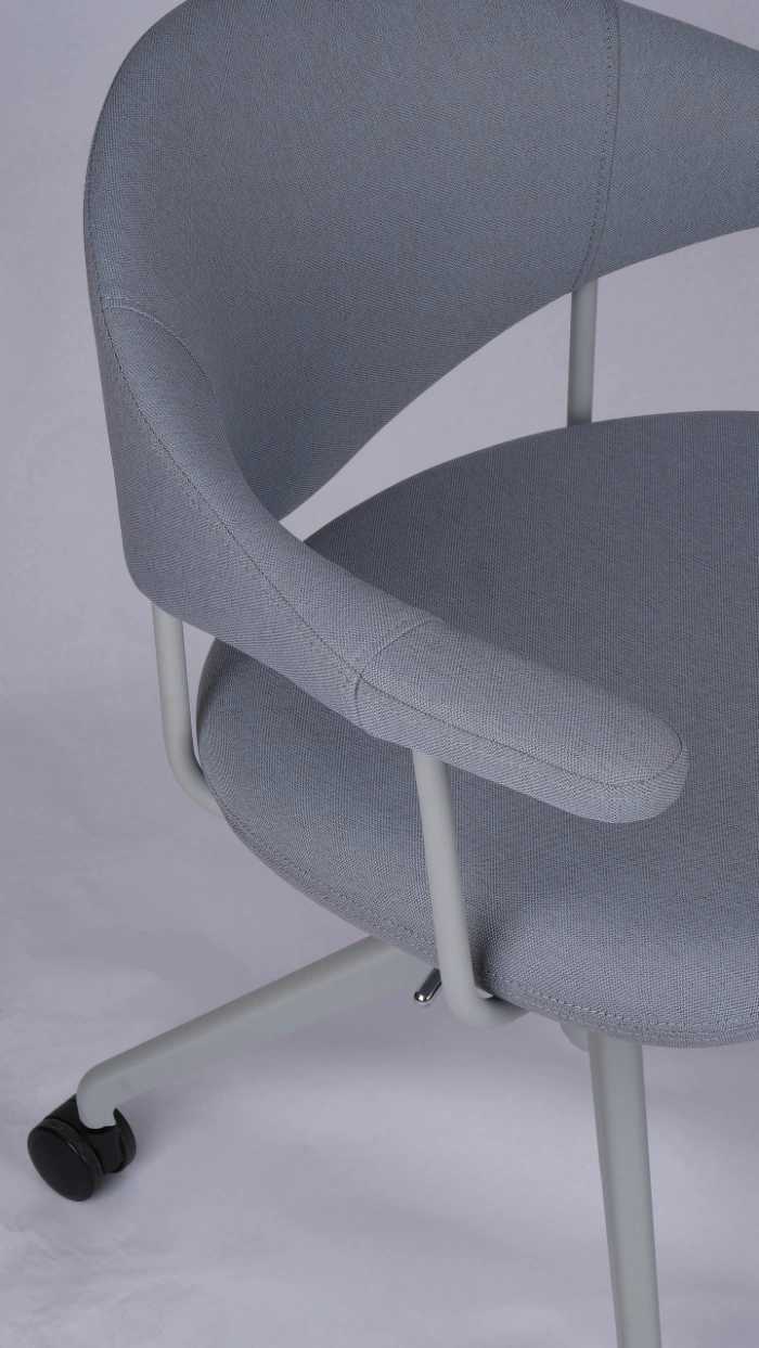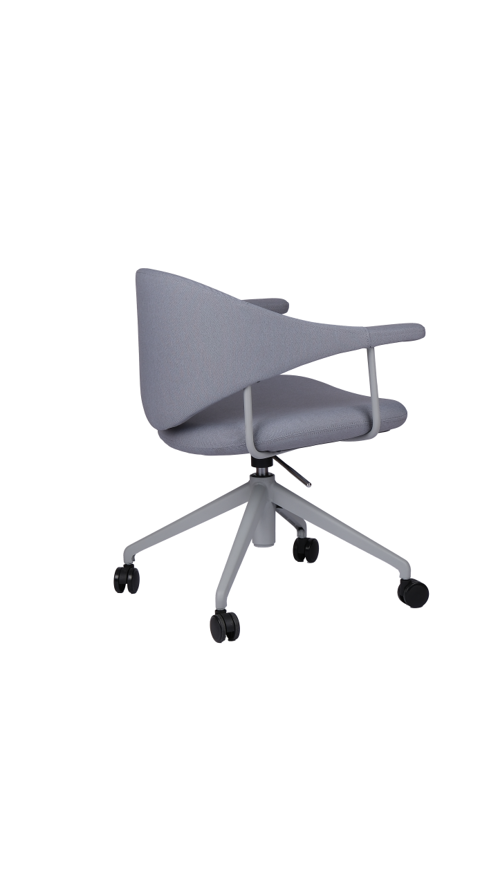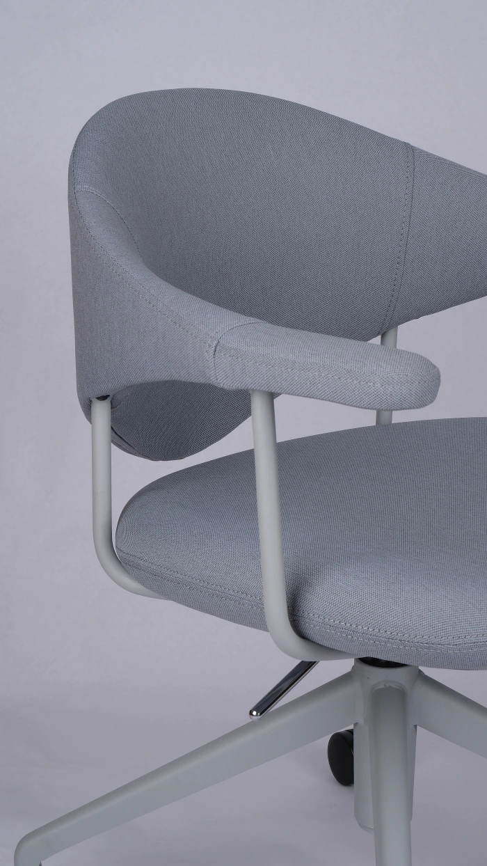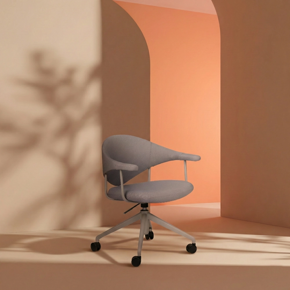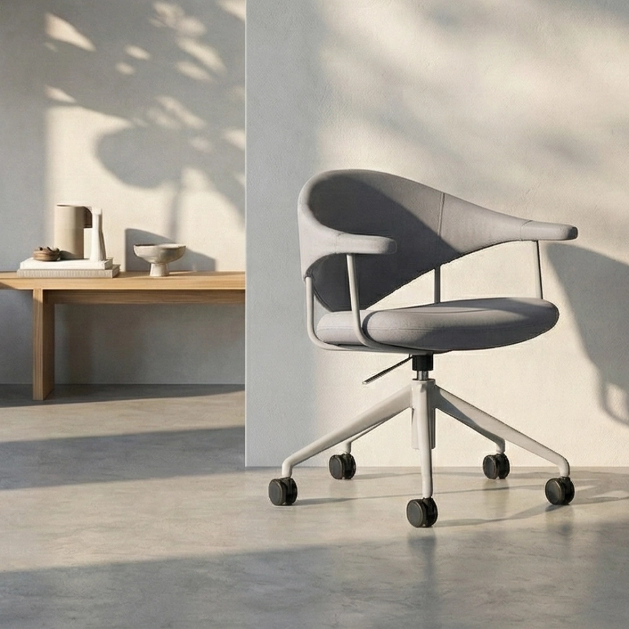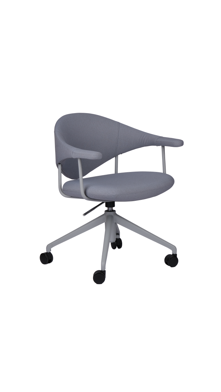 Its sculptural silhouette pairs a softly curved back with integrated armrests for supportive, all-day comfort, while a smooth-rolling castor base adds effortless mobility and a clean, modern stance. Offered in fabric, faux leather, or genuine leather to suit a wide range of interiors.