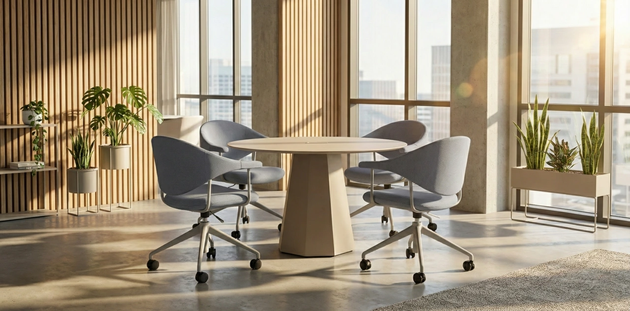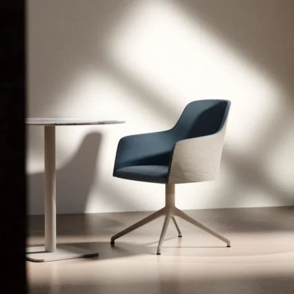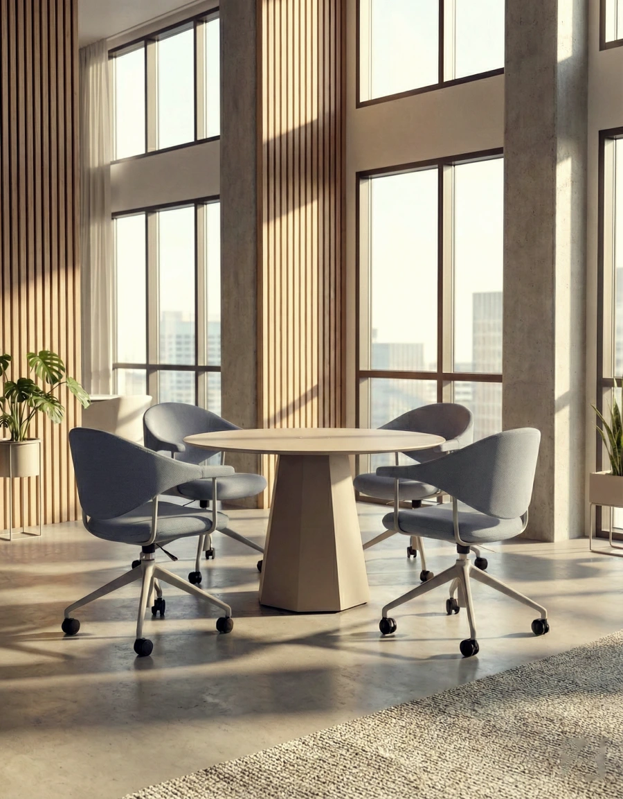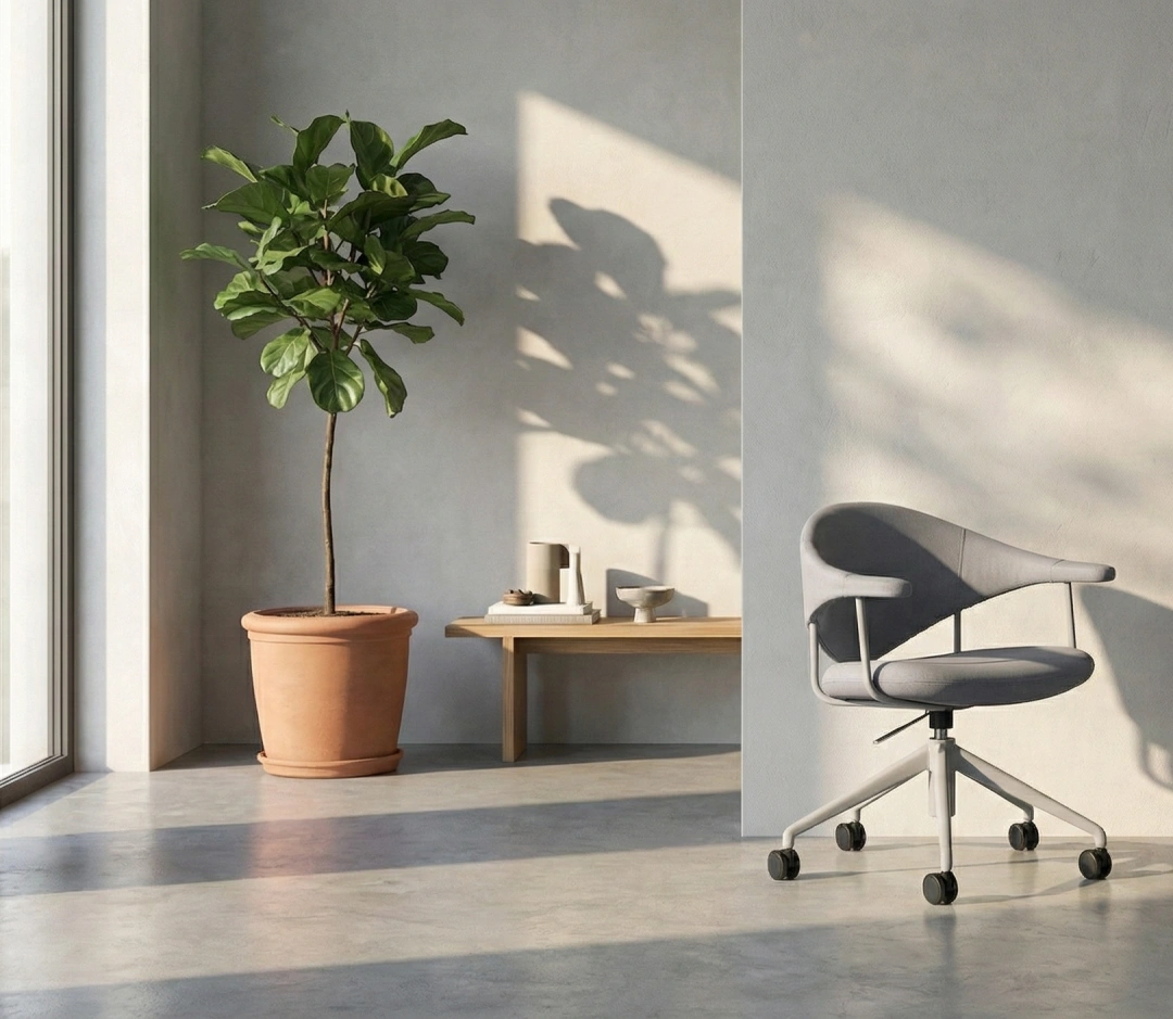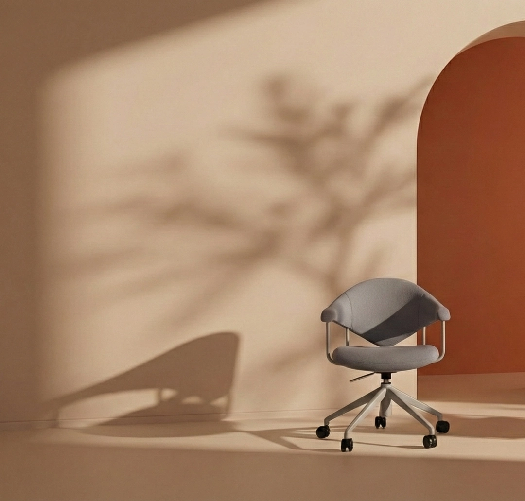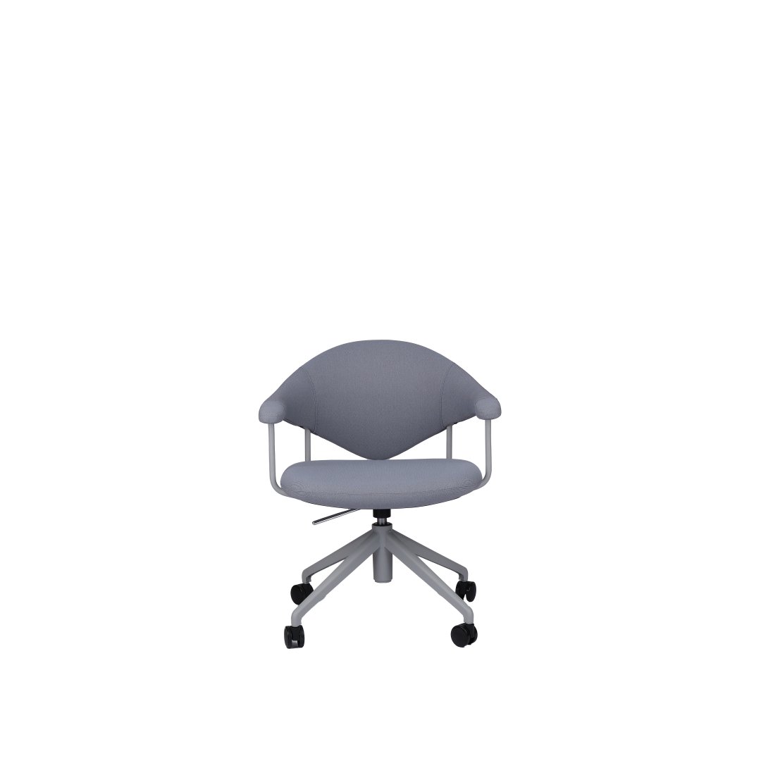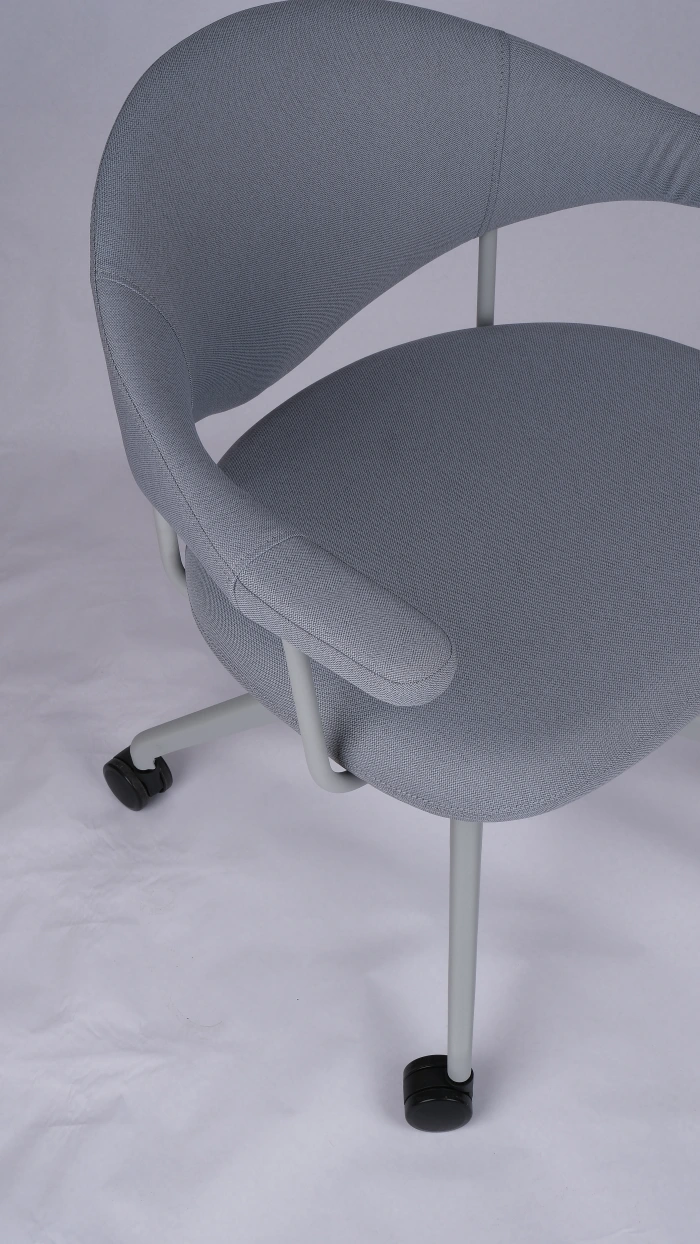 Its sculptural silhouette pairs a softly curved back with integrated armrests for supportive, all-day comfort, while a smooth-rolling castor base adds effortless mobility and a clean, modern stance. Offered in fabric, faux leather, or genuine leather to suit a wide range of interiors.